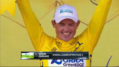 Simon Gerrans enjoyed his time on the podium after he pulled on the yellow jersey following Orica GreenEdge's winning performance in the team time trial.