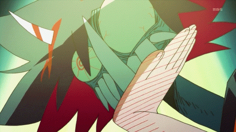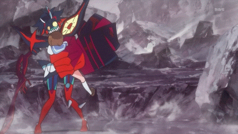 But the star of the episode is Mako. After Senketsu had warned Ryuko about keeping calm, and not getting her blood boiling, we see what happens when someone loses control of their emotions while wearing a life-fiber suit. This is presumably what happened to Aikuro and Kinigase's colleague: literally turning into a monster. But neither Nudist Beach, nor Satsuki joining the fray could pierce Ryuko's rampaging fugue state. But a Mako Moment saves the day: