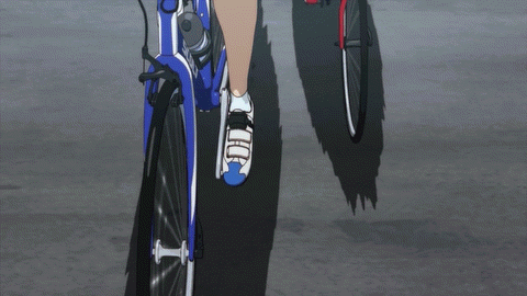 Quiet-guy is rocking a Corratec, and perm-guy has a Cannondale. Makishima likes hanging is helmet on his brake hoods like I used to do. The 2nd-years on their descent have their knees in the wrong position in the wide shot. Going left on that banked turn means the left knees should be tucked. In the close-up of perm-guy's legs, he's doing it correctly. A little mistake from the CGI guys. That black crank of his makes be think he put a Campagnolo on there. I don't know if SRAM was popular enough in Japan for the manga artist to include in his component designs. Tadokoro likes to click his big bear paws into a Shimano pedal. Finally, perm-guy's blocking tactics might get him relegated on a sprint approach, otherwise he's just being a real douche bag. The pros are a little more subtle about it.