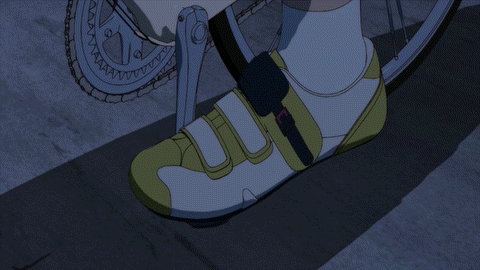 Back in Episode 13, we had a full-on Calorie Mate product placement. I guess we're back to good old Stamina Jelly. We've got some clicking in, clicking out. All those shoes look like Shimano shoes to me. We see Onoda recover nicely by making sure to land on his back wheel first. The Synchro Straight Twin shows the theoretical limit of a paceline, which is to follow the wheels as close as you can. Normally, it's a bad idea to overlap wheels, because sudden movement on that back wheel can wash out a front wheel. We see Quiet-guy give his thigh cramp the old Jens Voigt treatment, "Shut up, legs!" And finally, we see Onoda go all "guaah!" on the drops. To help visualize how much power this stance on the bike gives to your push down on the pedals, take a bungie cord in both hands, bend over, raise one of your legs, position the bungie cord underneath your foot, and simultaneously straighten your leg with a kick as you pull up on cord. On a bike, it's the frame that's the bungie cord, which is why sprinters talk about wanting a stiff frame. You also see that sprinters have bigger shoulders and chests than climbers, because they actually need that upper body strength to yank on the handlebars. They really do go "guaah!"