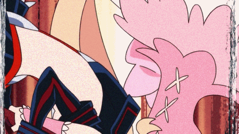 First exhale: Satsuki apologizes to Ryuko. To get all of her rough feelings for Satsuki out of her system, Ryuko proposes to smack Satstuki just once, full power. But the Inner Council won't let her, taking her blows instead, and realizing they weren't full power anyway. Ryuko suddenly has her eyes opened that they are also way-too-crazy friends for Satsuki just like Mako and Senketsu are to her. Satsuki admits to everything: trying to hone Ryuko into a weapon to use on her mother, manipulating her by dangling information about her father's death, but realizing her methods were wrong. The world, and the people in it, are too varied, too wonderful, for one way of thinking, and it is beautiful to behold. Then she offers her formal apology, and Ryuko says she doesn't want to hit her anymore. I'm not sure she was really going to hit her all that hard, if at all, but Satsuki's friends did.