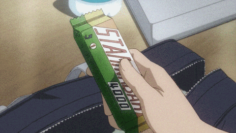 We've got a close-up of Calorie Mate's stamina bar and jelly, we've got a tight shot of a compact peloton, we've got Izumida in the full-on sprinter's hump, and we've got Naruko tossing his bottles to lighten his load. The sprinter's hump, head down, out of the saddle, hands on the drops, is the position that turns your entire body into a clenched muscle. You need strong shoulders, strong grip, strong abs, and strong glutes to keep accelerating in that position. It's also very dangerous, so don't do this on a busy street for very long.